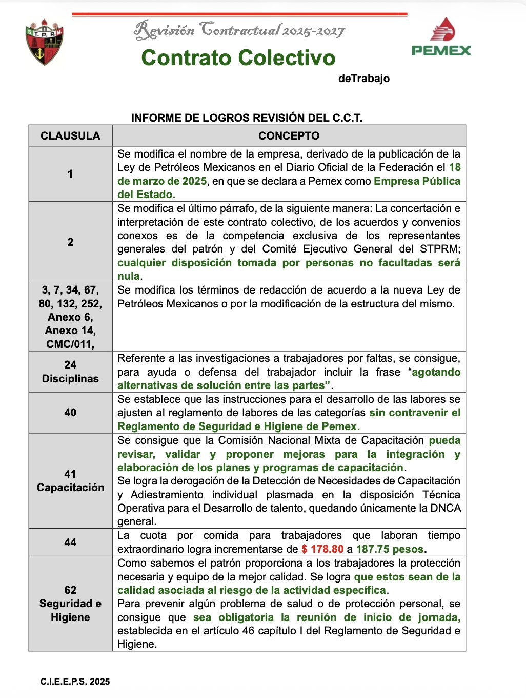 Denuncia al 9933989844… 🚩⚠️‼️👨‍🏭 ¡6 de Octubre, STPRM votará CCT 2025-27; eventual rechazo al Anexo 16!; el próximo 6 de octubre sindicalizados del STPRM votarán en las 36 secciones si aceptan o no la propuesta de Contrato Colectivo de Trabajo (CCT) 2025-2027 que derivado de la revisión que El Delfín de Deschamps, Ricardo Aldana Prieto, negoció con @Pemex ; situación que ha despertado un debate interno que revela tanto el descontento con lo pactado como el temor a las consecuencias de una eventual negativa en las votaciones en donde los caciques seccionales tienen la instrucción de coaccionar a sus agremiados en estos días previos para que acepten la propuesta, excepto en la Sección 44 STPRM de Los Chepes (Pilar y Zamudio) quienes se han pronunciado abiertamente sobre su rechazo al Anexo 16 por considerar que les quita un sinnúmero de prestaciones y el régimen de jubilación, aquí datado; inclusive hay diversos documentos que circulan entre los trabajadores petroleros que abordan de manera directa los escenarios legales y laborales que podrían presentarse si la mayoría opta por rechazar la propuesta sindical; entre la información que circula hay versiones que buscan responder inquietudes recurrentes y parten de un punto clave: existe un sector de la base trabajadora interesado en rechazar la revisión, aunque enfrenta la incertidumbre de qué sucedería en caso de hacerlo; la principal preocupación se concentra en la posible pérdida del empleo; sin embargo, expertos en la materia enfatizan que un voto en contra no implica despidos automáticos ni individuales ni colectivos, siendo que lo que perdería vigencia sería el CCT como marco colectivo, pero la relación laboral individual entre cada trabajador y @Pemex se mantendría intacta, protegida por la legislación laboral; la diferencia entre contrato colectivo y contrato individual resulta fundamental en este debate, aunque el acuerdo general con el STPRM podría quedar sin efecto, los contratos individuales y los derechos asociados a ellos permanecerían vigentes, además -a priori- las prestaciones ya adquiridas como vacaciones, primas o beneficios acumulados no desaparecerían, pues son reconocidas por ley como derechos consolidados de cada trabajador; en otras palabras, el rechazo de la revisión no regresaría a la plantilla a condiciones mínimas de ley, sino que preservaría lo ya establecido en los vínculos individuales; a la pregunta de ¿qué podría pasar después de un eventual rechazo? la consecuencia inmediata sería la necesidad de iniciar un nuevo proceso de negociación colectiva, ya no sobre la revisión rechazada, sino para elaborar un CCT completamente nuevo desde cero, escenario que genera otra inquietud: la posibilidad de que el nuevo CCT contemple prestaciones inferiores a las actuales; aunque este riesgo existe, cualquier nuevo acuerdo tendría que ser sometido nuevamente a consulta directa, personal, libre y secreta entre los trabajadores; es decir, la última palabra la volverían a tener los petroleros, quienes podrían rechazar condiciones que consideren menos favorables y obligar a continuar la negociación; en este panorama, la representación sindical adquiere un papel determinante; la titularidad del contrato, que corresponde al sindicato con mayor número de afiliados, seguiría en manos del STPRM en caso de rechazo, por lo que otro sindicato no podría exigir de inmediato negociar un nuevo acuerdo con @Pemex ; no obstante, este escenario podría cambiar si los trabajadores decidieran desafiliarse masivamente del STPRM y unirse a otra organización que lograra la mayoría; en ese caso, un sindicato distinto podría reclamar la titularidad y emplazar a @Pemex a firmar un nuevo CCT; al menos en papel, ni el empleo ni los derechos ya adquiridos corren peligro inmediato por el rechazo, pero la estabilidad futura dependerá del proceso de negociación colectiva y, sobre todo, de las decisiones de afiliación sindical que tomen los propios trabajadores; la clave, según esta interpretación, radica en la correlación de fuerzas sindicales: quién logre representar a la mayoría será quien tenga la capacidad legal de definir el nuevo contrato colectivo; atención @Claudiashein @MarcelaVilleg15 @SENER_mx @FGRmexico @LuzElena_GE @ASF_Mexico @PabloGomez1968 @SCJN @STPS_mx @Tu_IMSS @SEMARNAT_mx @agencia_asea @CENAGAS_mx @IMPetroleo @SATMX @Hacienda_Mexico @BuenGobierno_mx #RaquelBuenrostro #OIC #UIF….Zas!!!