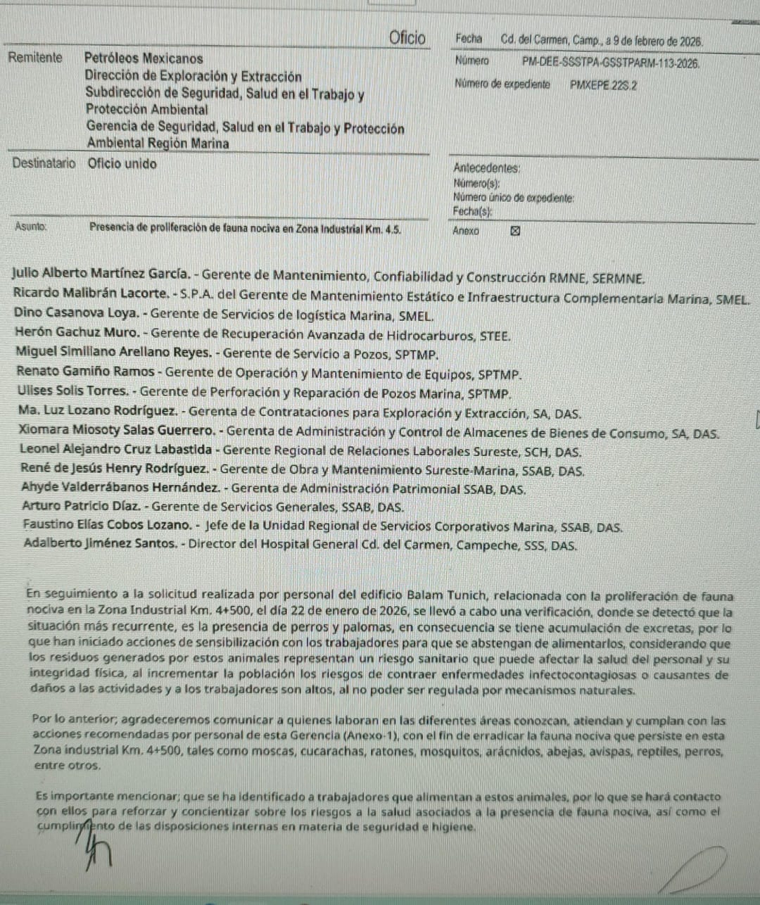Denuncia al 9933989844… 🚩⚠️ 🐕🙀 ¡CAPITANACHI, gerente zoofóbico de la SSTPA Pemex en km 4.5, acusan!; mediante el oficio PM-DEE-SSSTPA-GSSTPARM-113-2026 enviado el 09 de febrero 2025 por el gerente de Seguridad, Salud en el Trabajo y Protección Ambiental Región Marina (GSSTPARM), Enrique Capitanachi Reyes, con sede en la Zona Industrial del kilómetro 4.5 de Ciudad del Carmen, Campeche, con el que pretenden combatir la proliferación de fauna nociva. “Esto en seguimiento a la solicitud realizada por personal del edificio Balam Tunich del día 22 de enero de 2026, se llevó a cabo una verificación -reza el documento- donde se detectó que la situación más recurrente, es la presencia de perros y palomas, en consecuencia se tiene acumulación de excretas, por la que han iniciado acciones de sensibilización con los trabajadores para que se abstengan de alimentarlos, considerando que los residuos generados por estos animales representan un riesgo sanitario que puede afectar la salud del personal y su integridad física, al incrementar la población los riesgos de contraer enfermedades infecto contagiosas o causantes de daños a las actividades y a los trabajadores son altos, al no poder ser regulada por mecanismos naturales. Por lo anterior, agradeceremos comunicar a quienes laboran en las diferentes áreas conozcan, atiendan y cumplan con las acciones recomendadas por personal de esta Gerencia (Anexo-1), con el fin de erradicar la fauna nociva que persiste en esta zona industrial km. 4+500, tales como moscas, cucarachas, ratones, mosquitos, arácnidos, abejas, avispas, reptiles, perros, entre otros. Es importante mencionar que se ha identificado a trabajadores que alimentan a estos animales, por lo que se hará contacto con ellos para reforzar y concientizar sobre los riesgos a la salud asociados a la presencia de fauna nociva, así como el cumplimiento de las disposiciones internas en materia de seguridad e higiene. Paralelamente hemos iniciado las gestiones con Bienestar Animal del Municipio de Carmen, para tratar el retiro de la fauna canina de esta Zona Industrial Km. 4+500, sin embargo, es necesario la cooperación de todos para evitar ingresen nuevamente”. Esta situación ha generado descontento entre los trabajadores ya que señalan que el gerente Enrique Capitanachi Reyes actúa de la mano de Ramón Ruiz Márquez y María Antonia Rivera Pérez, quienes quieren mandar a sacar a los perros y gatos que han vivido allí por años, alimentados y cuidados por muchos de los trabajadores, para que por sí solos se salgan de las instalaciones a buscar comida en las calles ya que para muchas personas les es desagradable convivir con ellos, alegando que son fauna nociva y un peligro de acuerdo a los estatutos de la paraestatal, por lo que hacen un llamado a las asociaciones pro animales para que intervengan. atención @Claudiashein @MarcelaVilleg15 @CNE_Mex @SENER_mx @GobiernoMX @FGRmexico @LuzElena_GE @ASF_Mexico @SCJN @STPS_mx @Tu_IMSS @SEMARNAT_mx @agencia_asea @CENAGAS_mx @IMPetroleo @SATMX @Hacienda_Mexico @BuenGobierno_mx @Centrofcrl #OIC #UIF #OmarReyesColmenares …Zas!!!