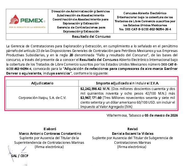 Denuncia al 9933989844… 🚩⚠️ ¡ITAIPU: Contrato de 72 MDP para EL VAMPIRO MORFERATU! Con lici simulada @Pemex beneficia a ITAIPU con empresas comparsas que hacen como que cuestionan pero se retiran a la hora de ofertar. @Pemex ocultó el monto económico de las ofertas. Tras la faramalla de simular competencia en el concurso DEE-CAT-B-GCEE-802-96394-26-4 para la adquisición de refacciones para compresores de aire marca Gardner Denver (dedazo por marca) o equivalente, incluye servicios, vigente hasta el 31 de diciembre de 2027, en el que empresas como Servicios y Suministros Integrales México y JAM Integral Solution sólo sirvieron de comparsa en la fase de dudas y aclaraciones con apenas algunos cuestionamientos, @Pemex terminó revelando el verdadero trasfondo con la asignación de un contrato por 2,242,598.42 pesos más 3,967,171.60 dólares (unos 72,630,537.21 pesos) para Corporación ITAIPU, propiedad de Venis Padilla Chan y Luis Fernando González Gutiérrez “El Vampiro Morferatu”, que fue la única que ofertó indebidamente en la apertura de propuestas económicas, que acumula ya 12 contratos con la 4T de @Pemex por más de 1,914,207,574.28 pesos. Aunque en las 2 etapas de preguntas y respuestas, aparecieron cuestionamientos y aclaraciones de este concurso por parte de Servicios y Suministros Integrales México y JAM Integral Solution, al momento de ofertar sólo lo hizo Corporación ITAIPU -que también cuestionó con representación de Diana Cristina Eliosa Torres- del Vampiro Morferatu, quien vino con la “cola entre las patas” luego que salió de la cárcel en Estados Unidos por meterle mano a dineros que no eran suyos en una empresa que administraba. Conforme al acta, ésta fue avalada con las firmas de los funcionarios de @Pemex : Daniela Escamilla Vidales, Sandy Astudillo Loeza, Marco Antonio Contreras Constantino y Claire Esperanza Cetina Puga de la Gerencia de Contrataciones para Exploración y Extracción. La opacidad siguió también en el acta de apertura de propuestas donde ITAIPU fue la única empresa que ofertó pero @Pemex mantuvo oculto el monto económico en el acta, incluso mantuvo oculta la evaluación de su propuesta en el acta posterior hasta la presentación del fallo violando las leyes y reglamentos de máxima transparencia que lleva las firmas de los funcionarios Daniela Escamilla Vidales, Sandy Astudillo Loeza, Marco Antonio Contreras Constantino y Claire Esperanza Cetina Puga. De los ahora 12 contratos que tiene ITAIPU con @Pemex la mayoría son durante el sexenio del Agrónomo/AMLO donde se afianzó gracias a la relación con JJ Pérez Damas hermano carnal de JC Pérez Damas, quien fue ex gerente de Exploración y con quien se apalancaron aunque luego lo corrieron de @Pemex por corrupto. Lleva 4 asignaciones (658815804, 658815802, 653025805 y el reciente) en el sexenio de Sheinbaum/Padilla, 7 (643023817, 643024600, 648023605, 648233809, 648812803, 648813800 y 648020600) en el periodo de AMLO/Agrónomo y 1 (423024811) con EPN/Treviño. Atención @Claudiashein @MarcelaVilleg15 @CNE_Mex @SENER_mx @GobiernoMX @FGRmexico @LuzElena_GE @ASF_Mexico  @SCJN @STPS_mx @Tu_IMSS @SEMARNAT_mx @agencia_asea @CENAGAS_mx @IMPetroleo @SATMX @Hacienda_Mexico @BuenGobierno_mx @Centrofcrl #OIC #UIF #OmarReyesColmenares …Zas!!!