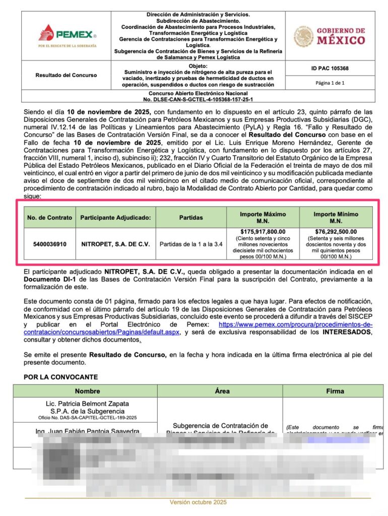 Denuncia al 9933989844… 🚩⚠️‼️¡Monopoliza NITROPET/BLACKROCK inyección de nitrógeno en Pemex por 3.4 MMDP!; Nitropet, representada en distintos contratos con @Pemex por Fermín Roberto Contreras Plata y Víctor Samuel Amador Cota, que pertenece a Grupo Linde México @Lindemexico (que se fusionó con Praxair en 2018), a cargo de Josué Lee, parte de la corporación global Linde PLC, la cual es propiedad de sus accionistas, incluyendo grandes fondos de inversión como @Vanguard_Group y @BlackRock , recibió el fallo de la licitación DLSE-CAN-S-GCTEL (Luis Enrique Moreno Hernández) 4-105368-157-25-1, partidas de la 1 a la 3.4 por un monto de 175,917,800.00 pesos para suministro e inyección de nitrógeno de alta pureza para el vaciado, inertizado y pruebas de hermeticidad de ductos en operación, suspendidos o ductos con riesgo de sustracción a @Pemex Logística de Israel Benítez López; el acta del resultado fue firmada por Patricia Belmont Zapata de la Subgerencia de Contratación de la Refinería Salamanca; la convocatoria para este concurso fue emitida por Luis Enrique Moreno Hernández, gerente de Contrataciones para Transformación Energética y Logística (GCTEL), el 1 de junio de 2025, tras celebrarse la apertura de propuestas donde indebidamente no se mostraron los montos, @Pemex ordenó una segunda apertura con descuento, donde tanto Nitropet como Cryoinfra bajaron sus ofertas, el cambio quedó así: Cryoinfra propuso al principio un importe máximo de 276,735,000 pesos pero lo bajó hasta 253,569,000 pesos; por su parte, Nitropet primero ofertó 212,069,000 pesos luego se tiró al piso hasta 175,917,800 pesos y fue seleccionada por @Pemex al final del concurso; ahora Nitropet lleva 6 contratos con la petrolera nacional, 2 en lo que va del sexenio de Sheinbaum/Padilla, 3 desde el periodo de AMLO/Agrónomo, y 1 desde EPN/Treviño que en conjunto suman 3,489,182,555.44 pesos: 1.- Contrato 651005804 para inyección de gas nitrógeno en pozos petroleros e instalaciones de PEP (ahora DEE), contrato B el 5 de marzo de 2025 al 31 de diciembre de 2027 por medio de Adjudicación Directa por un monto de 1,821,153,900.44 pesos; 2.- Contrato 5400034429 para suministro e inyección de nitrógeno de alta pureza para el vaciado e inertización de ductos suspendidos y ductos con alto riesgo de sustracción el 31 de marzo de 2023 al 30 de noviembre de 2024 por un monto de 98,714,061 pesos; 3.- Contrato 5400035413 para suministro e inyección de nitrógeno gaseoso para el inertizado de recipientes y tuberías del Complejo Procesador de Gas Burgos vigente del 29 de septiembre al 15 de diciembre de 2023 por 3,489,825 pesos; 4.- Contrato 5400033959 para suministro e inyección de nitrógeno de alta pureza para el vaciado e inertización del poliducto de 16” D.N. Tula-Azcapotzalco del 27 al 28 de diciembre de 2021, asignado en calidad de “emergencia” por 1,941,671 pesos; 5.- Contrato 424042823 para la ejecución de operaciones de inyección de gas nitrógeno con equipo criogénico en pozos petroleros e instalaciones de PEP (DEE) de la Región Norte (ahora SERN) (Paquete I) vigente desde el 13 de agosto de 2012 al 31 de diciembre de 2024, por 1,387,965,298 pesos; atención @Claudiashein @MarcelaVilleg15 @CNE_Mex @SENER_mx @GobiernoMX @FGRmexico @LuzElena_GE @ASF_Mexico  @SCJN @STPS_mx @Tu_IMSS @SEMARNAT_mx @agencia_asea @CENAGAS_mx @IMPetroleo @SATMX @Hacienda_Mexico @BuenGobierno_mx @Centrofcrl #OIC #UIF #OmarReyesColmenares …Zas!!!