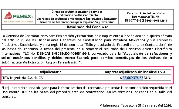 Denuncia al 9933989844… 🚩⚠️ 👉 ¡TRW: 2 Dedazo Pemex por 33.6 MDP para refaccionamiento SEALTEK con todo y trampas! La empresa yucateca TRW Ingeniería con beneficiarios a Nerio Román y Víctor Manuel Rueda Olán, Concepción Wiliam Pérez y Tessio Rea Tufiño, recibió el fallo de la licitación DEE-CAT-B-GCEE-500-104651-26-1 para la adquisición de refacciones y sellos mecánicos sencillos y dobles marca SEALTEK para bombas centrífugas de los Activos de la Subdirección de Extracción Región Terrestre Sur (SERTS) de José Luis Guzmán Almazo por 33,660,376.66 pesos. Sin embargo, desde el inicio del “concurso” estuvo cantado que este contrato sería suyo, ya que en la Apertura de Propuestas Económicas no sólo fue la única opción, sino que funcionarios de @Pemex le incrementaron el monto de la propuesta original de 31,977,357.83 pesos a 33,360,376.66 pesos en el fallo, es decir, le subieron 1,683,018.83 pesos más sin explicación alguna. Lo peor es que TRW Ingeniería intentó pasarse de listo y engañar con suministrar refacciones patito a la paraestatal. En las respuestas emitidas por @Pemex en la Primera Junta de Aclaraciones, TRW Ingeniería intentó cambiar a su favor el plazo de entrega de los bienes de 60 a 80 días naturales (pregunta 2), a lo que @Pemex se negó. Además aunque en el objetivo de las bases de esta licitación señala que “los bienes son refacciones SEALTEK”, TRW Ingeniería preguntó si podría suministrar las refacciones de otra marca, aunque las refacciones no sean compatibles con la marca de sellos ya instalados, derivado que @Pemex advierte que “se están refaccionando para continuar con su operación”; sin embargo, @Pemex rechazó la solicitud e insistió que “las marcas equivalentes a surtir deben ser compatibles con las características físicas y técnicas a las que deben usar los sellos ya instalados”. Con esta asignación, TRW Ingeniería firmó su segundo contrato con @Pemex para surtir refacciones SEALTEK (que en los hechos deben de supervisar para que no haga trampa en detrimento de @Pemex como lo anunció en el proceso concursal). El primero fue el 645004609 para adquisición de refacciones y sellos mecánicos sencillos y dobles marca SEALTEK para bombas centrífugas de los Activos de Producción Región Sur, que estuvo vigente del 02/08/2024 al 31/12/2024, por 27,980,423.00 pesos, por lo que suma en ambos 61,640,799.66 pesos: 1 con AMLO/Agrónomo y 1 con Sheinbaum/Padilla. Atención @Claudiashein @MarcelaVilleg15 @CNE_Mex @SENER_mx @GobiernoMX @FGRmexico @LuzElena_GE @ASF_Mexico  @SCJN @STPS_mx @Tu_IMSS @SEMARNAT_mx @agencia_asea @CENAGAS_mx @IMPetroleo @SATMX @Hacienda_Mexico @BuenGobierno_mx @Centrofcrl #OIC #UIF #OmarReyesColmenares …Zas!!!